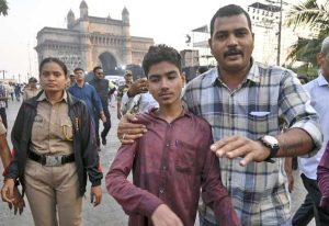 A passenger, centre, is accompanied by the police after being rescued following an incident in which an Indian Navy speedboat lost control and crashed into a ferry carrying 100 passengers off the Mumbai coast, in Mumbai, Wednesday, Dec. 18, 2024. (AP Photo)