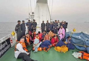 เผยเรือเร็วทัพอินเดีย – Rescue operations were conducted with assistance from the Indian Navy, Coast Guard, and Marine Police. The coordinated effort involved 11 Navy boats, three Marine Police boats, one Coast Guard vessel, and four helicopters. (PTI photo)