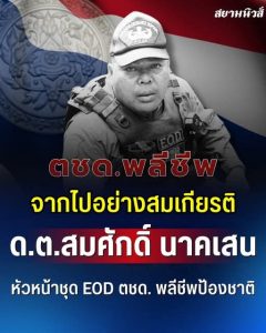 เสียชีวิตจากเหตุปะทะระหว่างเข้าปฏิบัติภารกิจเก็บกู้วัตถุระเบิด ในปฏิบัติการบังคับใช้กฎหมาย พื้นที่ อ.สายบุรี จว.ปัตตานี เมื่อวันที่ 15 ตุลาคม 2568 สำนักงานตำรวจแห่งชาติสดุดีในความกล้าหาญ ทุ่มเท โดยพร้อมดูแลสิทธิประโยชน์และสวัสดิการอย่างเต็มที่