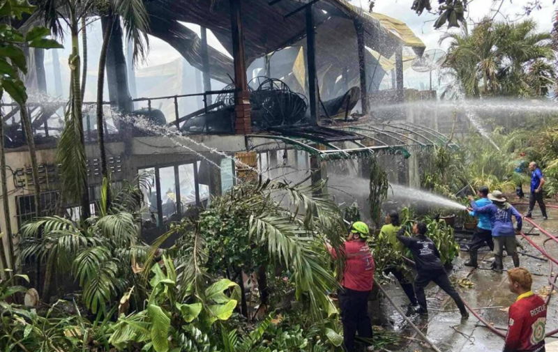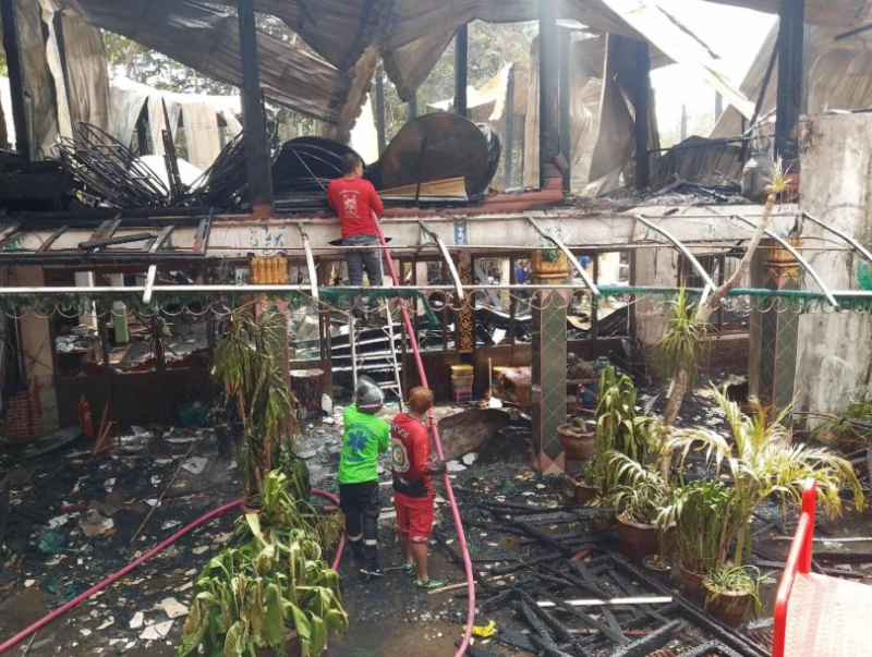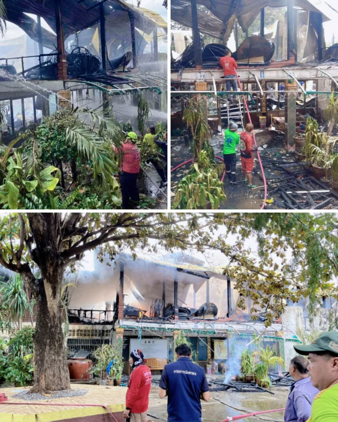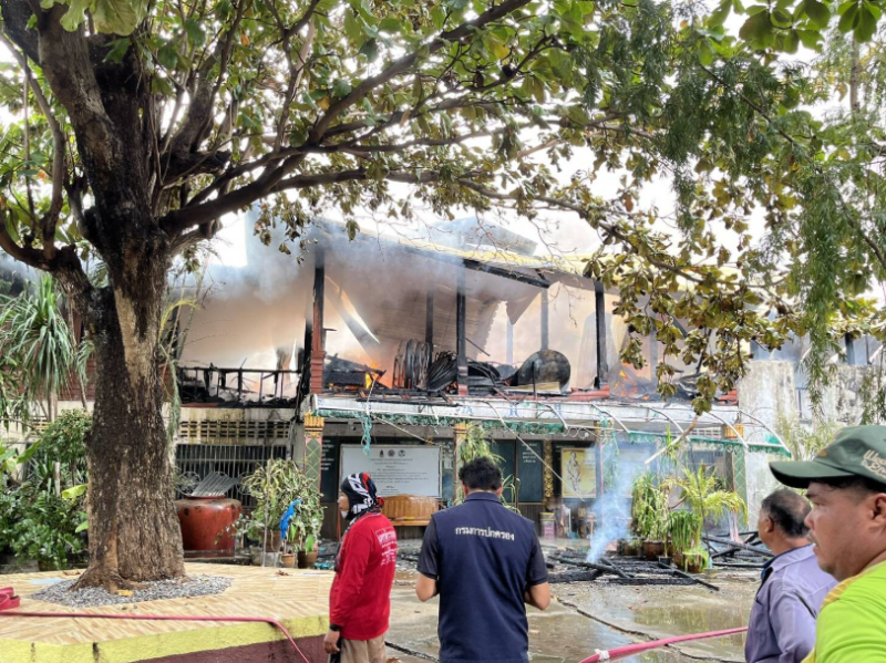 โดยสถานที่เกิดเหตุเป็นศาลาเอนกประสงค์ โครงสร้างสูง 2 ชั้น ครึ่งปูนครึ่งไม้ ชั้นล่างเป็นพื้นที่จัดกิจกรรมสงฆ์ ข้างบนเป็นกุฏิที่พัก พบเปลวเพลิงกำลังลุกไหม้อย่างรุนแรง พระสงฆ์ สามเณรและชาวบ้านช่วยกันเร่งขนย้ายทรัพย์สินมีค่าและหาน้ำมาสาดดับไฟที่กำลังลุกลามขยายวงกว้าง
