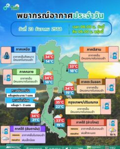 วันที่ 23 ธันวาคม 2568 มีรายงานว่า กรมอุตุนิยมวิทยา พยากรณ์อากาศ 24 ชั่วโมงข้างหน้า บริเวณความกดอากาศสูงหรือมวลอากาศเย็นที่ปกคลุมประเทศไทยตอนบนมีกำลังอ่อนลง ในขณะที่ลมตะวันตกเฉียงเหนือในระดับบนยังคงพัดปกคลุมประเทศไทยตอนบน