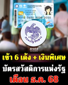 เงินพิเศษบัตรสวัสดิการแห่งรัฐ งวดแรก เดือนพฤศจิกายน 2568 กรมบัญชีกลางโอนเงินเข้าให้ผู้ถือบัตรสวัสดิการแห่งรัฐโดยตรงเป็นที่เรียบร้อยแล้ว จำนวนเงิน 850 บาทต่อคนต่อเดือน รวมกับเงินซื้อสินค้าเดิม 300 บาท รวมเป็น 1,150 บาท โดยโอนให้ จำนวน 2 รอบ (พ.ย.-ธ.ค.68 ) เน้นย้ำผู้ถือบัตรใช้จ่ายให้หมดภายในเดือนนั้นๆ เพราะเป็นวงเงินที่ไม่สะสมในเดือนถัดไป และกดเป็นเงินสดไม่ได้ซึ่งงวดที่ 2 เงินพิเศษบัตรสวัสดิการแห่งรัฐ เดือนธันวาคม 2568 ผู้มีสิทธิสามารถใช้สิทธิผ่านบัตรประจำตัวประชาชนแบบสมาร์ทการ์ด วงเงินเหมือนเดิม 1,150 บาท